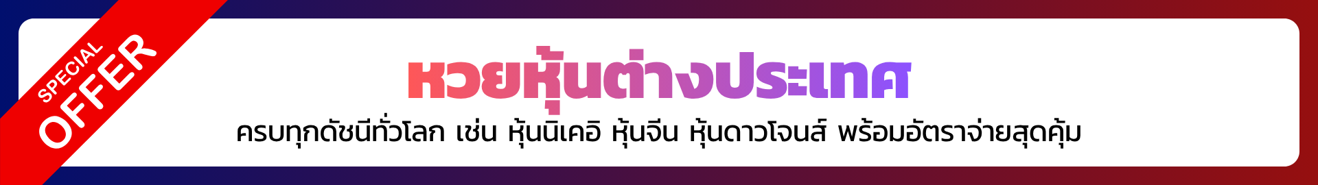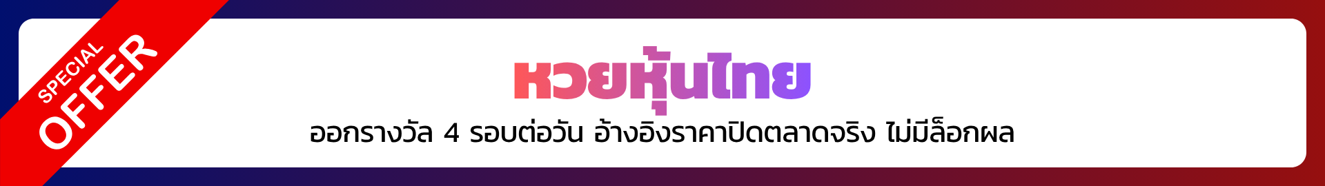 หวยหุ้นไทย–ต่างประเทศ | วันจันทร์–ศุกร์ (ตามเวลาตลาดหุ้น) | 3 ตัวบน บาทละ 970 / 2 ตัว บาทละ 97 |